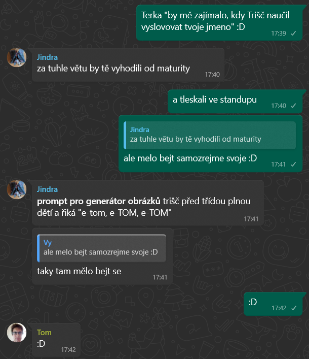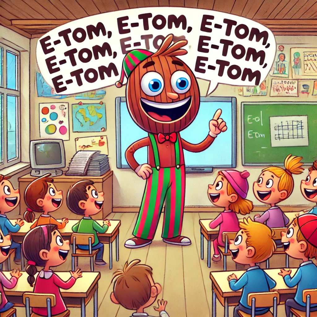Trišč před třídou plnou dětí a řiká “e-tom, e-TOM, e-TOM”